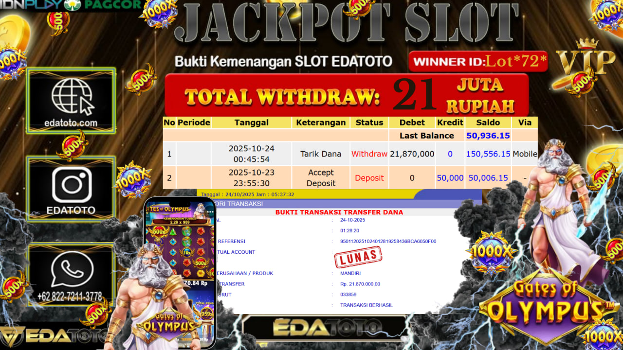 Selamat Kepada Pemilik user ID : CIh89* Hari/Tanggal : Selasa/ 21, Oktober 2025 Jackpot : Rp. 18.708.000 JT Permainan : . . .