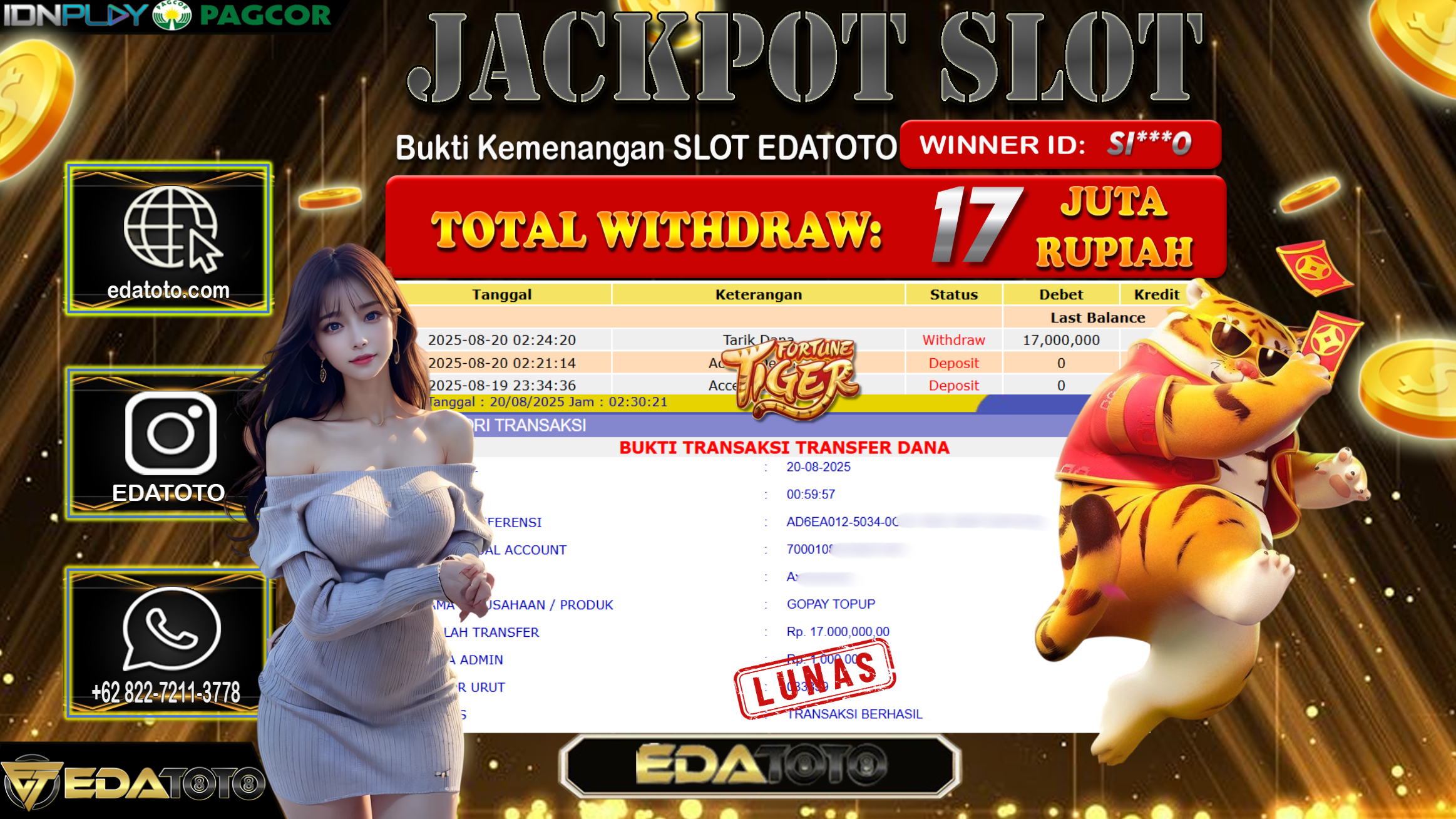 Selamat Kepada Pemilik user ID : Ay***t Hari/Tanggal : Rabu/ 20, Agustus 2025 Jackpot : Rp. 17.000.000 JT Permainan : . . .