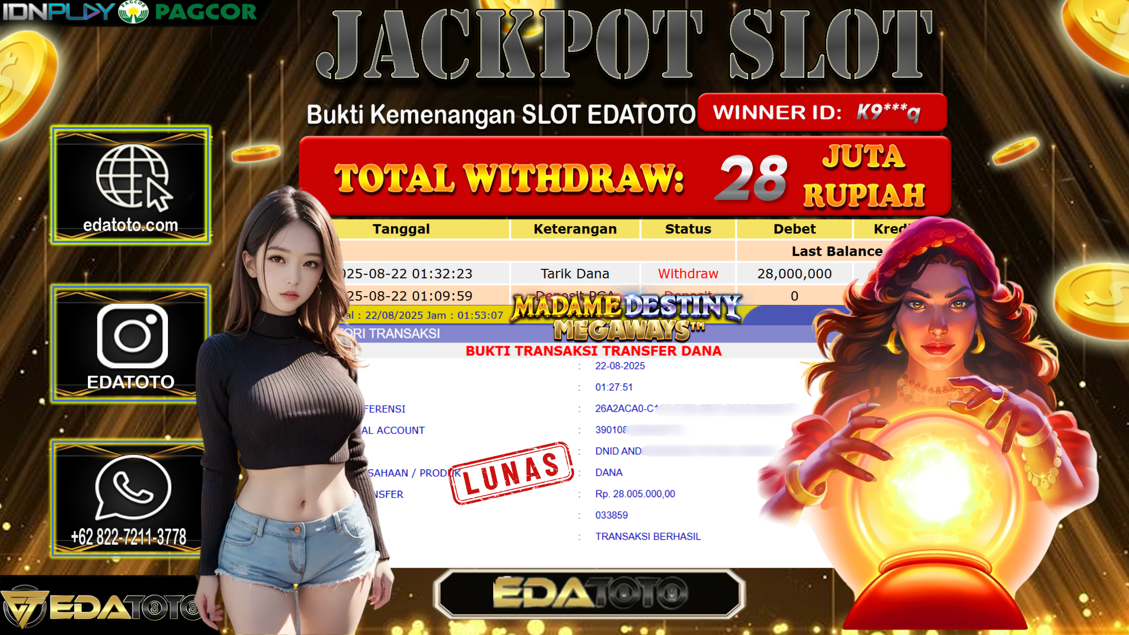Selamat Kepada Pemilik user ID : K9***q Hari/Tanggal : Jumat/ 22, Agustus 2025 Jackpot : Rp. 28.000.000 JT Permainan : . . .
