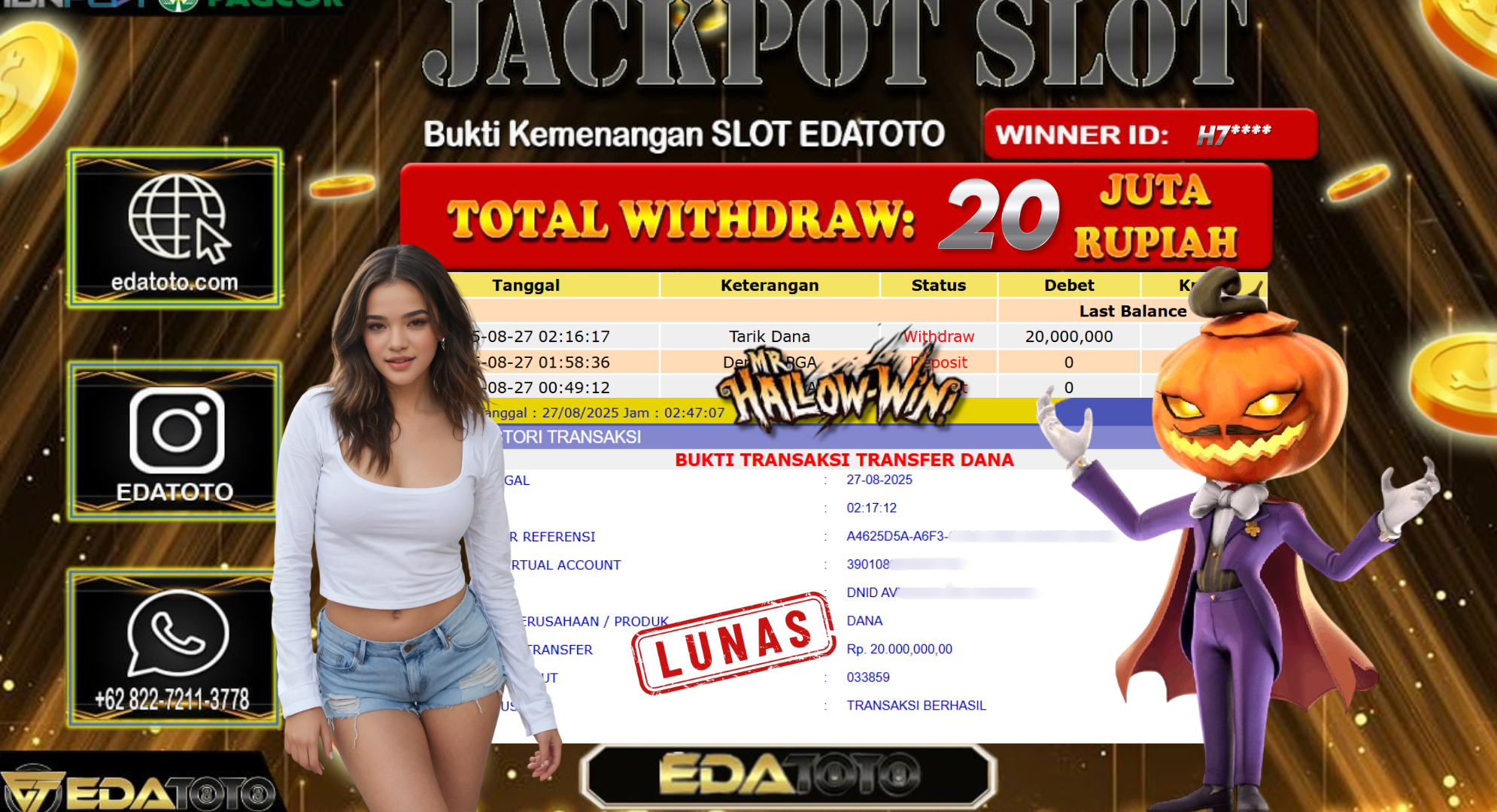 Selamat Kepada Pemilik user ID : H7**** Hari/Tanggal : Rabu/ 27, Agustus 2025 Jackpot : Rp. 20.000.000 JT Permainan : . . .