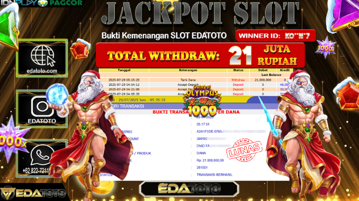 Selamat Kepada Pemilik user ID : KO**N*7 Hari/Tanggal : Selasa/ 29, Juli 2025 Jackpot : Rp. 21.000.000 JT Permainan : Gate . . .